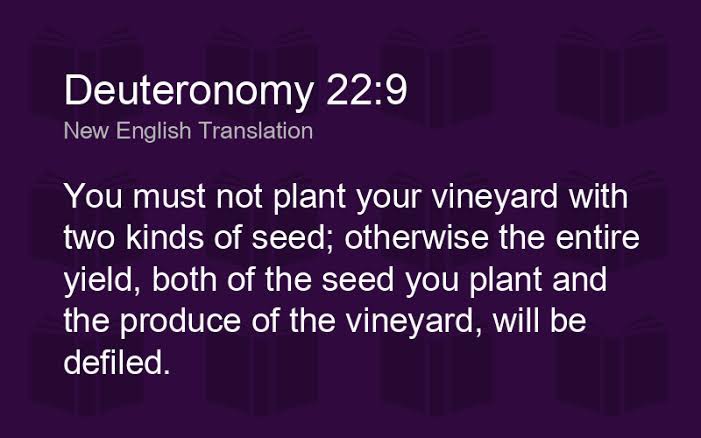 Deuteronomy 22:9 “You shall not sow your vineyard with different kinds of seed, lest the yield of the seed which you have sown and the fruit of your vineyard be defiled.